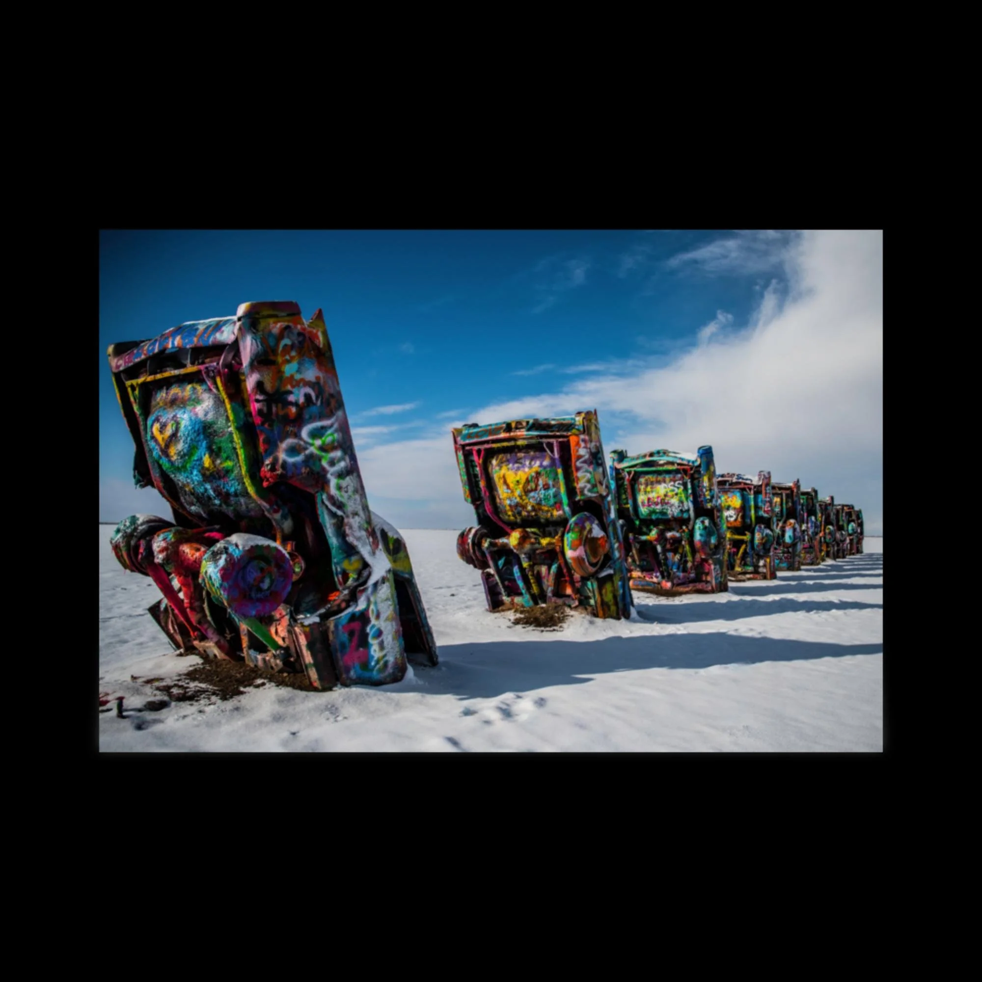 A striking image of Cadillac Ranch in Amarillo, TX, captured with a fresh layer of snow blanketing the ground. The vibrant, graffiti-covered Cadillacs stand in sharp contrast against the white snow, blending the iconic roadside art installation with the rare winter landscape along historic Route 66. This photograph highlights the unexpected serenity of a well-known landmark, offering a unique perspective on Americana and roadside culture.