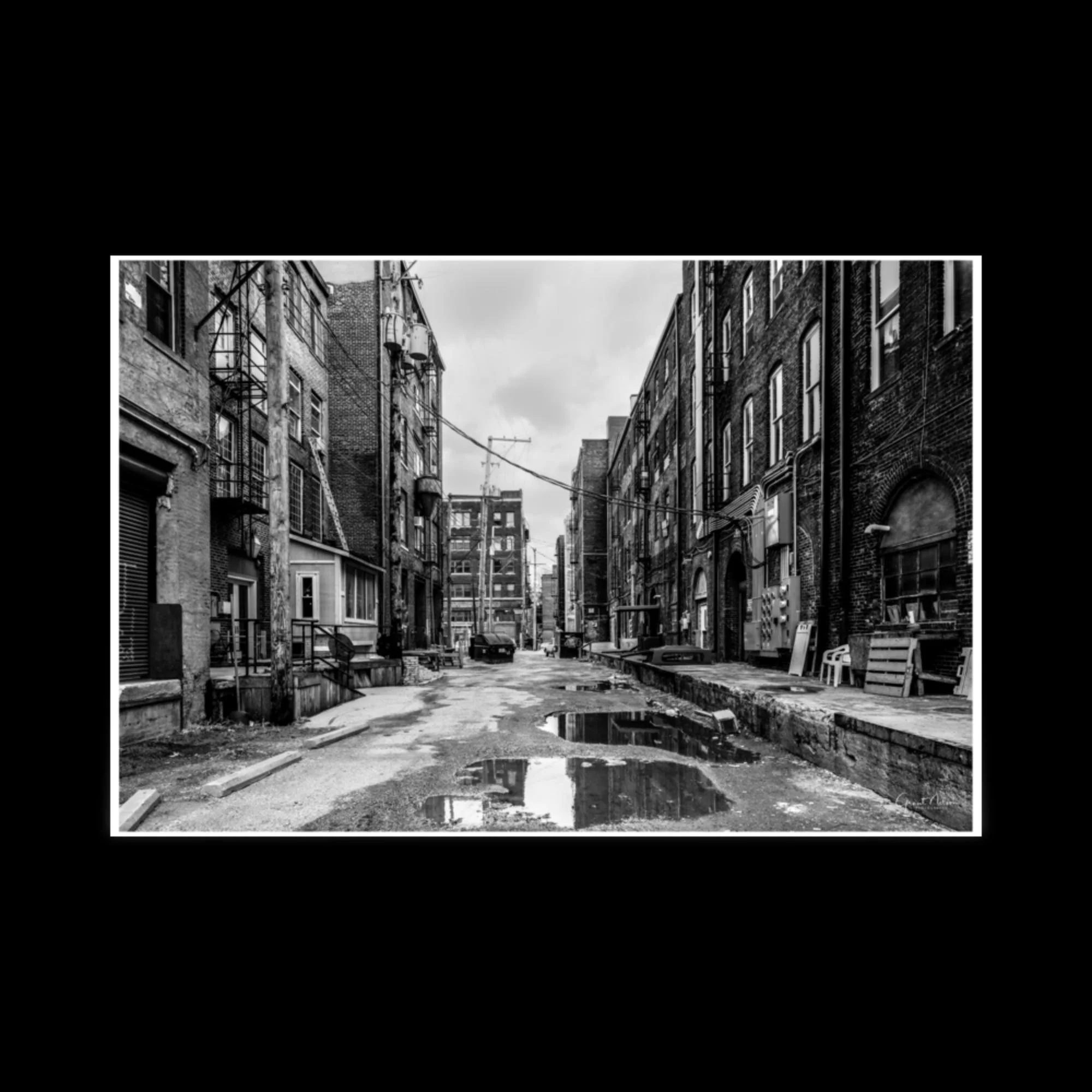 This black and white photograph captures Kansas City's historic West Bottoms district moments after a rainstorm. The glistening streets reflect the soft light of a cloudy sky, highlighting the weathered brick buildings and industrial architecture that define the area’s rich past. The absence of color emphasizes textures and contrasts, bringing a timeless quality to the scene and inviting viewers to explore the layered history beneath the surface.